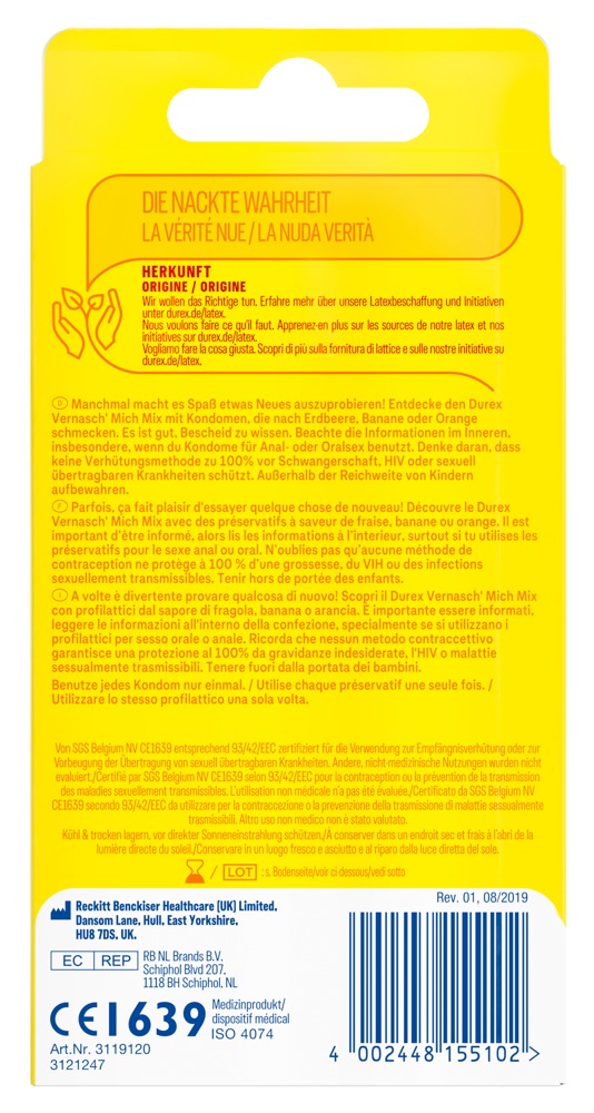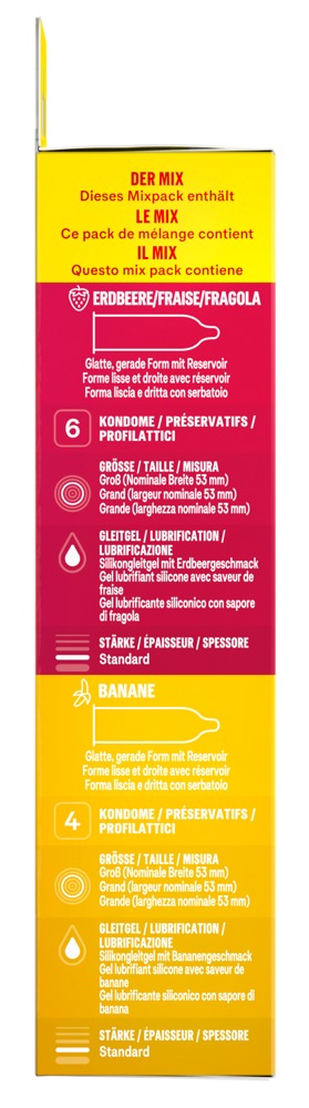 Velkjent Durex-kvalitet og fruktige typer utgjør denne kondommiksen med 6 x jordbær, 4 x banan og 4 x appelsinaroma.