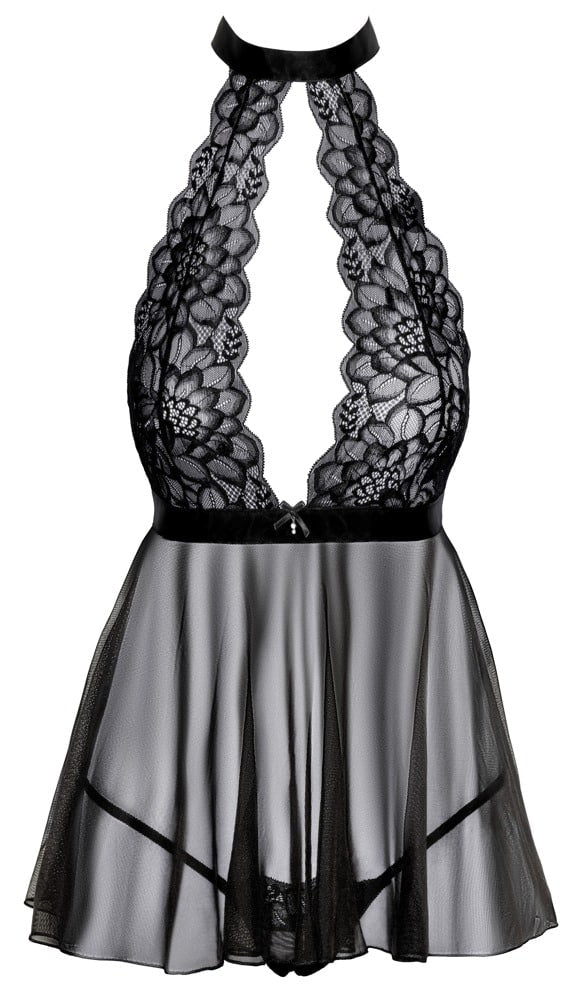 Kort, utsvingt babydoll fra kissable laget av vakker, gjennomsiktig, svart blonde (øverste del) og delikat powernet (skjørtedel). Den er fløyelsmyk og elastisk for en komfortabel passform. Den ryggløse babydollen har en stor utskjæring i utringningen. Satinkragen kan knytes sammen bak på nakken, satinkorsettet kan knytes sammen bak. Den matchende lille stringen er inkludert.
