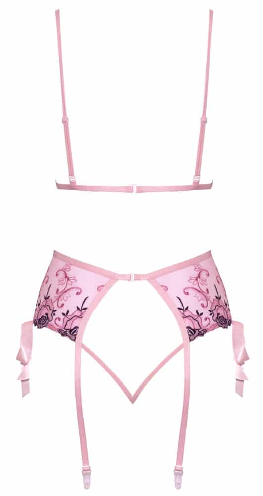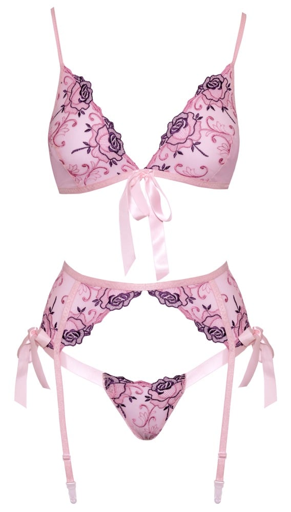 Den trådløse BH-en, strømpebeltet & stringen i et sett fra kissable er laget helt av delikat lys rosa powernet med utsøkt blomsterbroderi. Den er myk og elastisk, noe som betyr at den er veldig behagelig å ha på seg. Det er en leken satengsløyfe foran på den trådløse BH-en og på hver side av stringen. BH-en har en klipsfeste bak og stroppene er justerbare. Strømpebeltet har en krokfeste bak og justerbare strømpebeltestropper. Den lille stringen er ekstremt forførende på grunn av sine to smale elastiske stropper som møtes i skrittområdet.