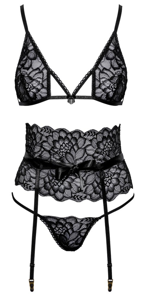 Trådløs BH, strømpebelte & string laget av delikat svart blonder i et elegant sett fra kissable. Alle delene er myke og elastiske for en behagelig passform. Den stilige BH-en har en krokfeste bak og justerbare stropper. Strømpebeltet fremhever midjeområdet og har iøynefallende satengstropper som kan knytes sammen foran midjen. Det har krokfester bak, og strømpebeltestroppene kan justeres. Den forførende lille stringen har to smale elastiske stropper som møtes i skrittområdet.