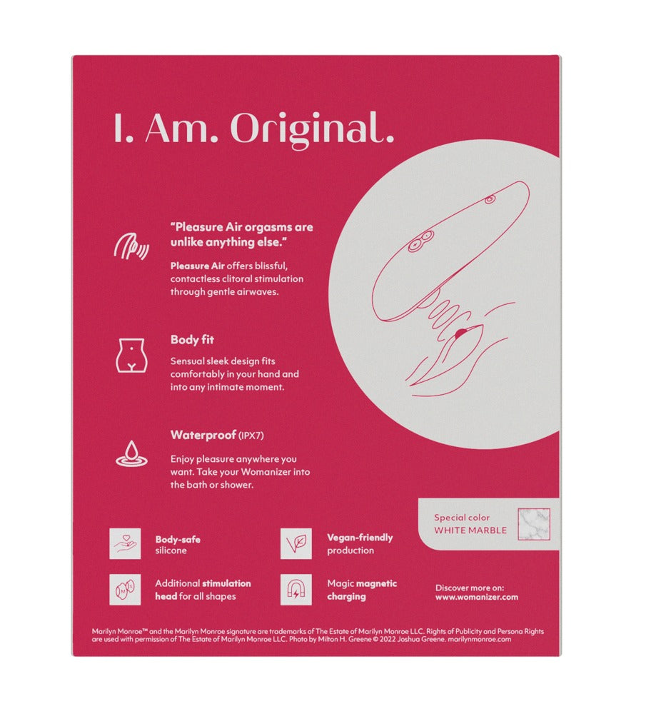 Womanizeren fra den fargekoordinerte Marilyn Monroe Spesialutgaven er en kraftig, men hviskende stille trykkbølge stimulator som gir glede til en person med 10 forskjellige intensiteter. Intensitetene kan enkelt justeres med (+/-) knappen. Den patenterte Pleasure Air-teknologien gir presis stimulering av klitoris uten å komme i kontakt med den. Den kan også brukes i badekaret eller dusjen fordi den er vanntett. Womanizeren går tilbake til den laveste innstillingen når knappen er trykket – for en avslappende avslutning på en orgasme (Etterglød-funksjon).